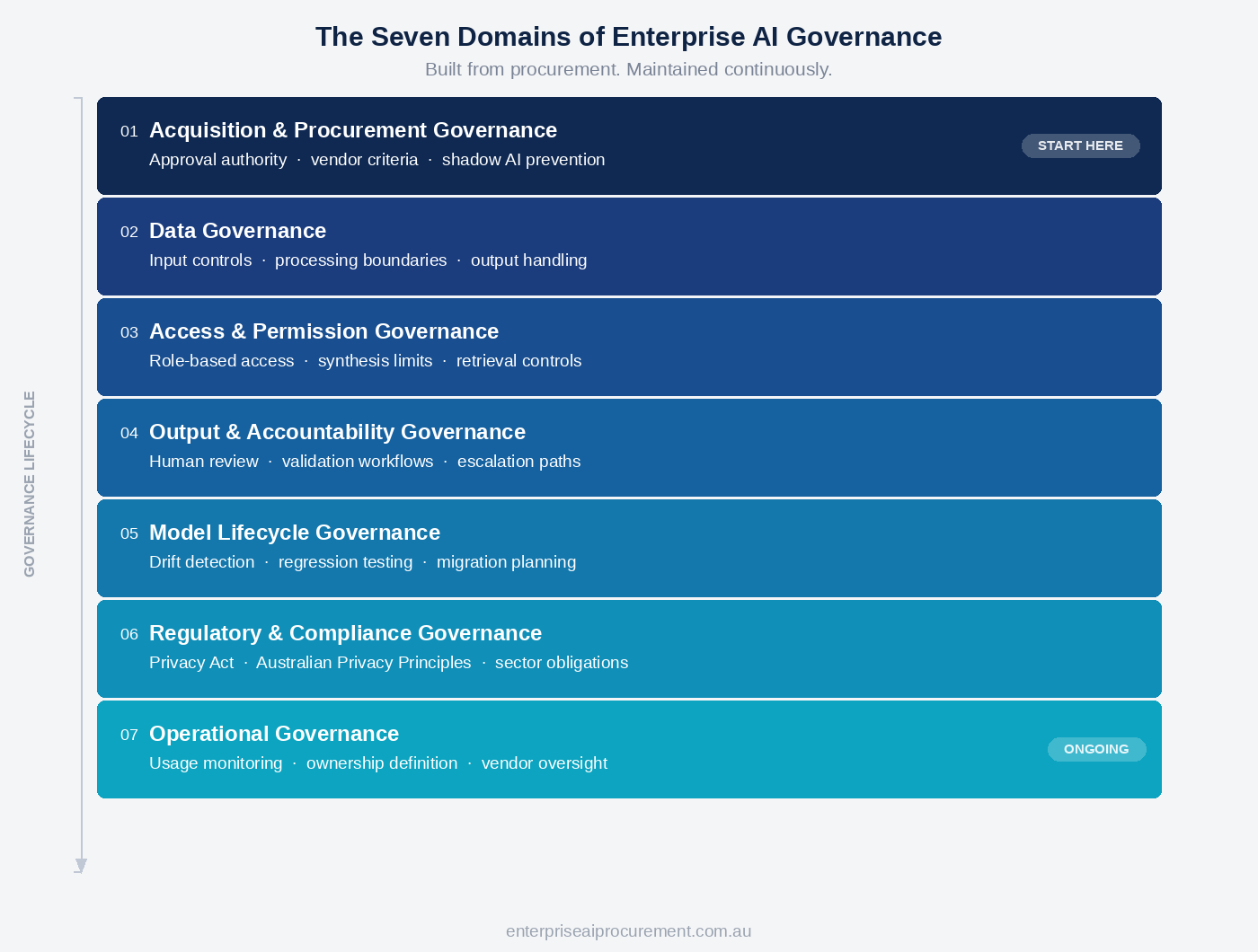 Enterprise AI governance operates across seven domains: acquisition and procurement, data, access and permissions, output and accountability, model lifecycle, regulatory compliance, and operational oversight. Each addresses a distinct category of risk. Together, they form the governance infrastructure that enterprise AI requires.
